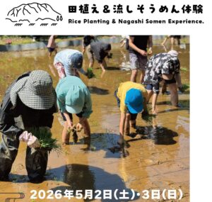 田植え体験+流しそうめん食べ放題は満席となりましたが、キャンセルが出たため、5月3日に関しまして、数名様追加募集を行っております。